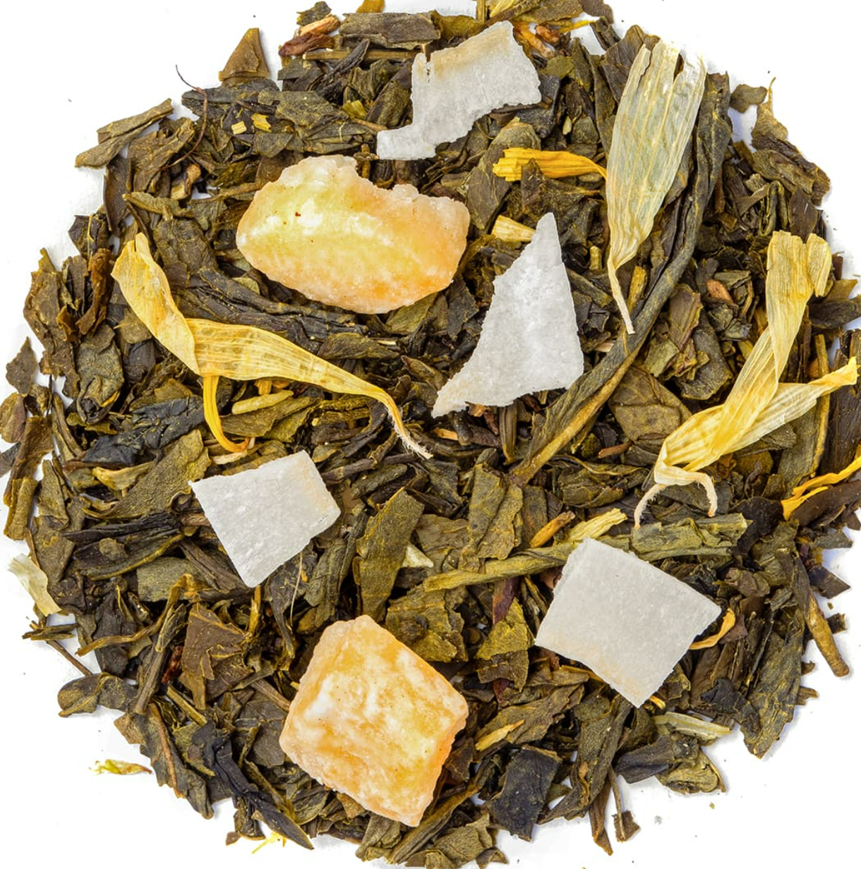 Ingrédients : Thé vert China Sencha, coco (coco, graisse de coco, sucre), ananas (ananas, sucre) (16%), arôme, fleurs de souci.