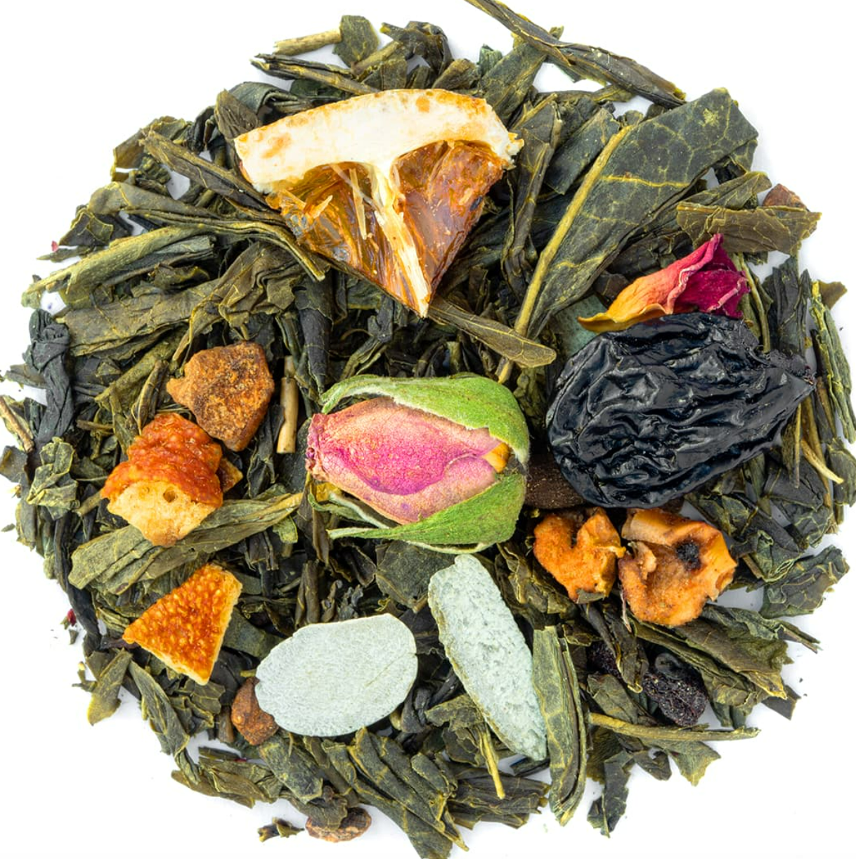 Ingrédients : Thé vert China Sencha (76%), pomme, bâtons de cannelle, écorces d’orange, arôme naturel d’orange, AMANDE, pétales de rose, boutons de rose, tranches d’orange, clou de girofle, arôme naturel, vanille.